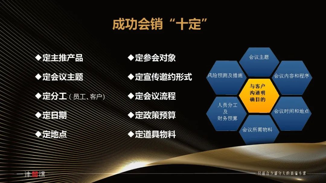 “会”前的工作做足80%,余下的20%就在会上的“销”售成交。所以会前十定内容需要慎重。