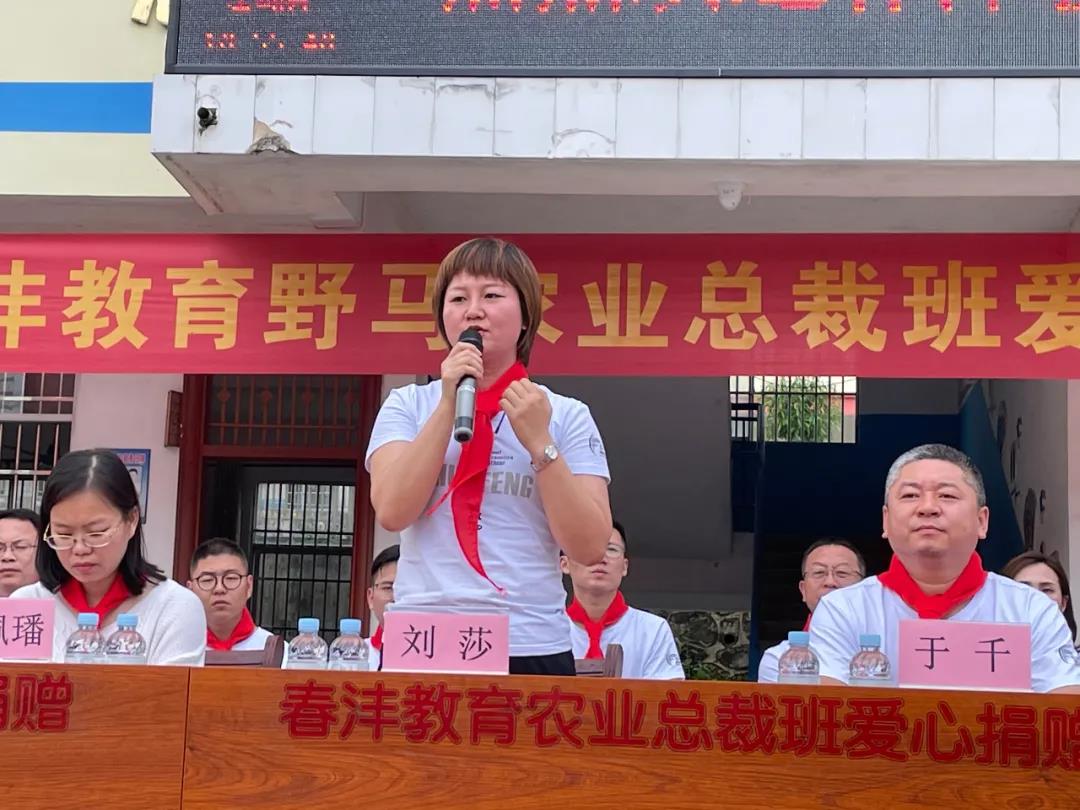 只要人人都献出一点爱,世界将变成美好人间!春沣教育野马农业总裁班二期班长刘莎代表总裁班的全体学员上台发表讲话。刘班长说,看见孩子们可爱的面庞,她深受触动,学员们用自己的力量帮助孩子们,这是一件非常有意义的事。大山里也能开出希望的花朵,最后她鼓励孩子们要坚强奋进,好好学习,努力成才!